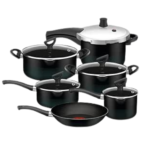 Você pode incluir uma panela de pressão, caçarolas, frigideiras específicas como wok e omeleteira, além de tampas extras.