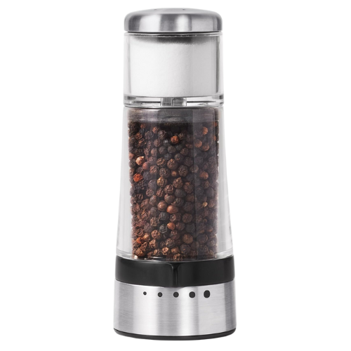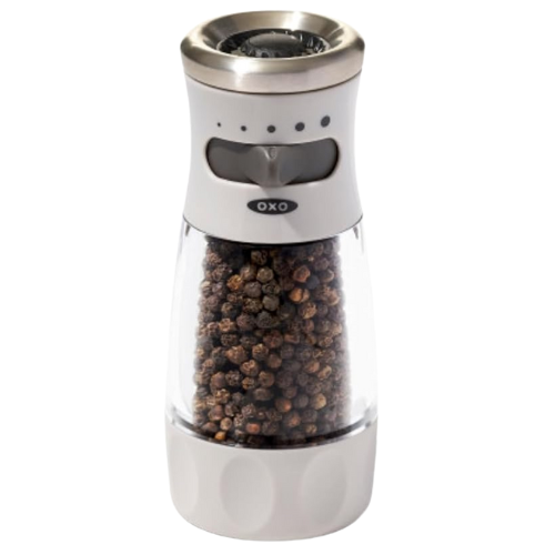 Usei o moedor de pimenta OXO Good Grips e seu design em aço inoxidável e acrílico transparentes não são apenas bonitos, mas também muito práticos.